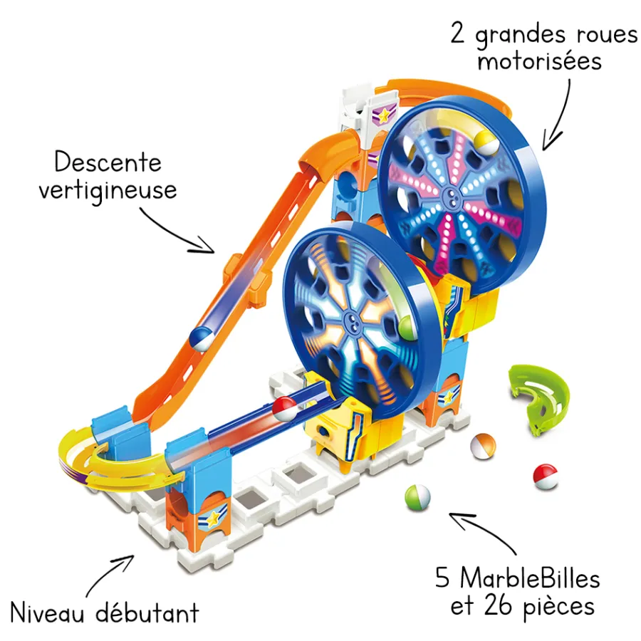 Bienvenue A La Fete Foraine ! Place Aux Sensations Avec Les 2 Grandes Roues Motorisees Et Les Cascades Impressionnantes De Ce Circuit Compatible Avec Tous Les Circuits Marble Rush.