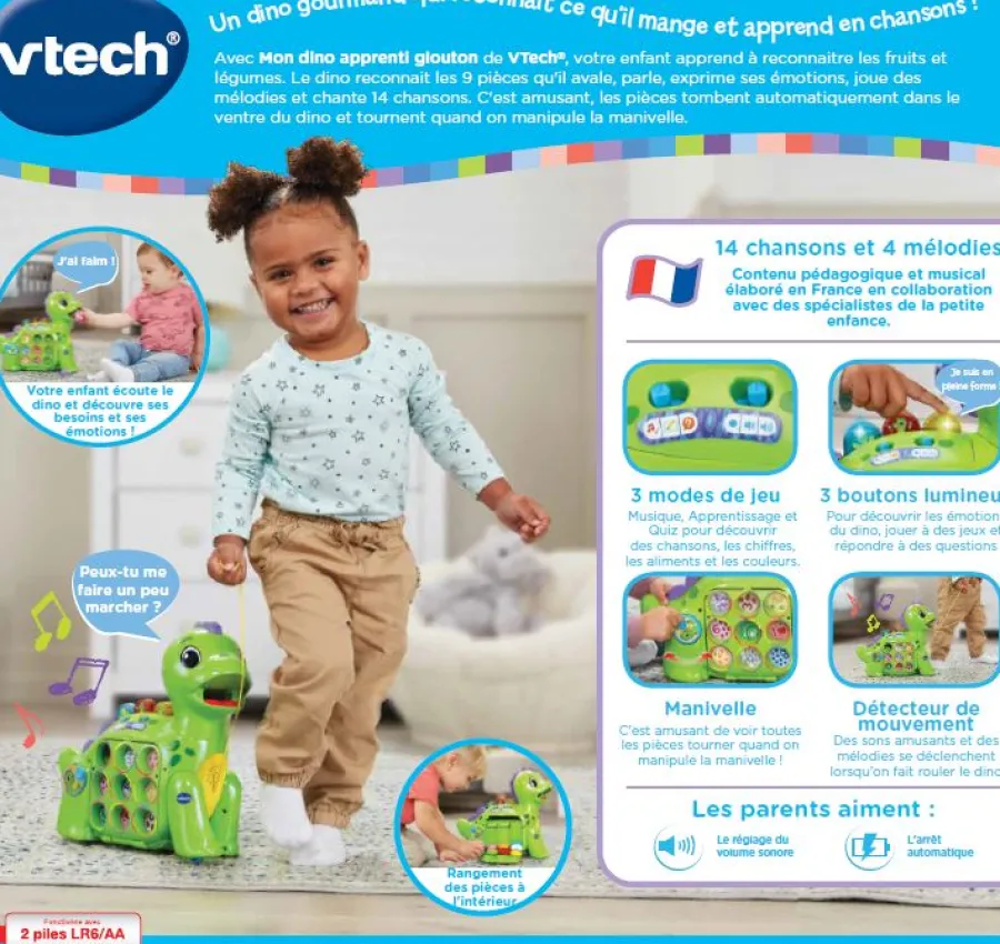 Ce Dino Musical Et Interactif Reconnait Ce Qu’Il Mange Et Apprend En Chansons ! Votre Enfant S’Amuse Avec 3 Modes De Jeux Et 14 Chansons. De 18 Mois A 4 Ans.